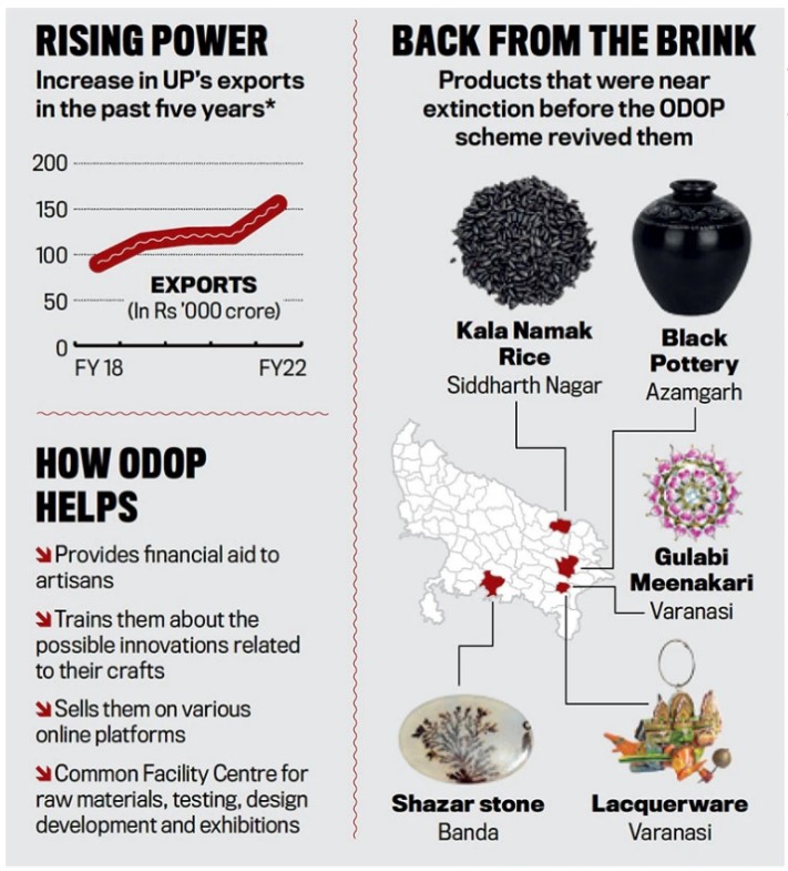 • ODOP is aimed at creating product-specific traditional industrial hubs across 75 districts of the State that will promote traditional industries that are synonymous with the respective districts of the state.