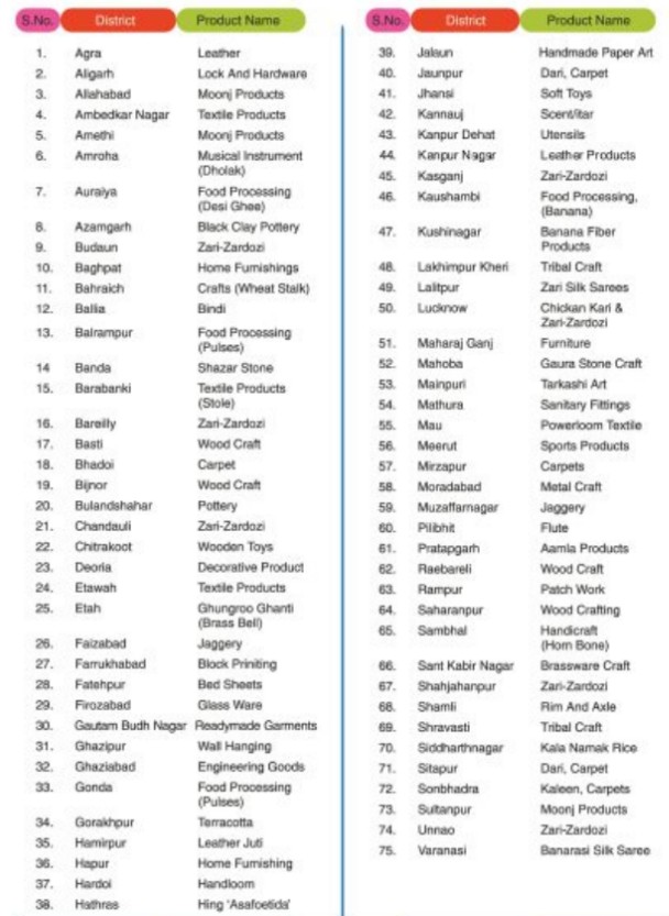 • One District One Product (ODOP) is a flagship programme of the Government of Uttar Pradesh. It was launched in 2018, with an aim to preserve, develop and promote local arts, crafts, and traditional skills of communities.