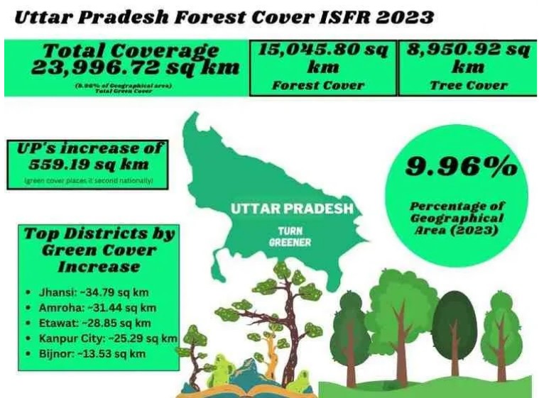 • The state has gained E\expansion of +559 km² in combined forest and tree cover since 2021—UP ranks second in India, just behind Chhattisgarh.
