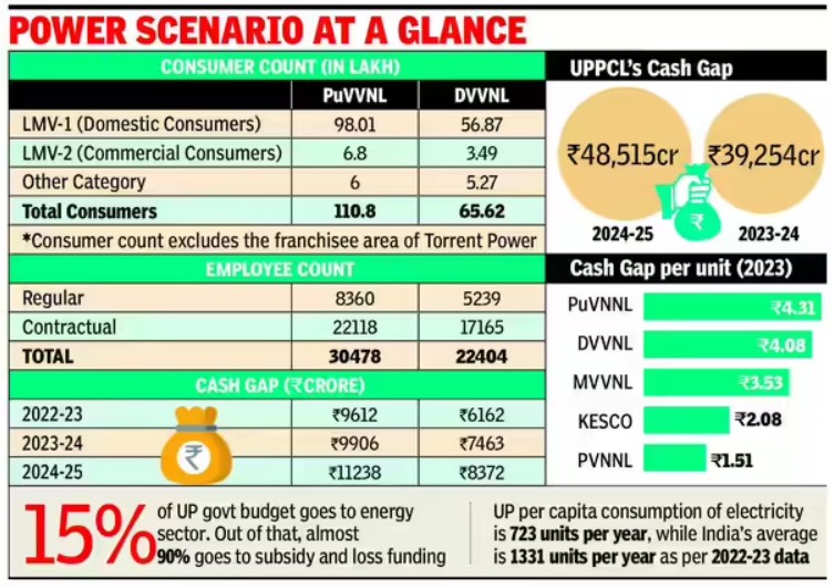 • UPPCL reported a ₹48,515 crore cash gap for FY 2024–25, largely from Purvanchal & Dakshinanchal regions of the State.