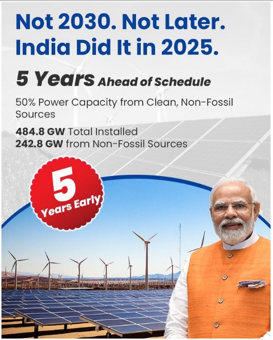 • India has achieved a landmark in its energy transition journey by reaching 50% of its installed electricity capacity from non-fossil fuel sources—five years ahead of the target set under its Nationally Determined Contributions (NDCs) to the Paris Agreement.