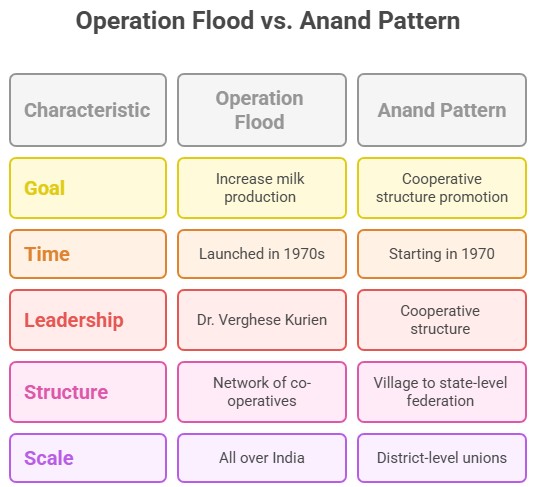 - The ‘Anand Pattern’ was essentially a cooperative structure comprising village-level Dairy Cooperative Societies (DCSs), which promote district-level unions, which in turn promote state-level marketing federation. Starting in 1970, NDDB replicated the Anand Pattern cooperatives through the Operation Flood programme all over India.