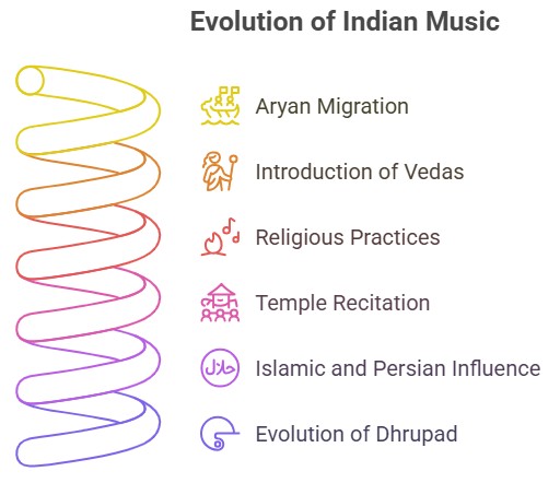 - The appearance of North Indian music was altered by the introduction of Islamic and Persian components. For instance, by the 15th century, the Dhruvapad or devotional style had evolved into the Dhrupad style.