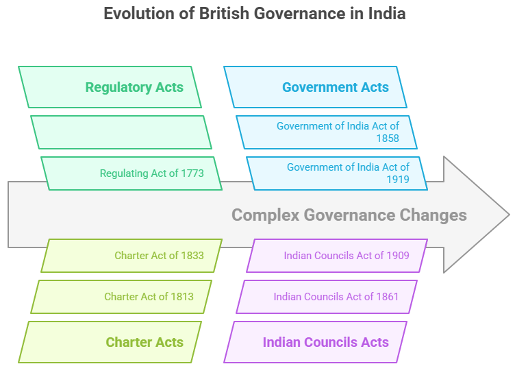 Regulating Act of 1773, Charter Act of 1833, Indian Councils Act of 1861, Government of India Act of 1919, Government of India Act of 1935 etc. |