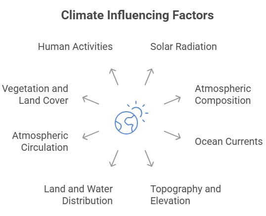 Climate refers to the long-term average weather conditions of a particular region or the Earth as a whole. It is influenced by various factors that can be categorized into natural factors and human factors. Understanding these factors is essential for comprehending climate patterns and predicting future changes.
