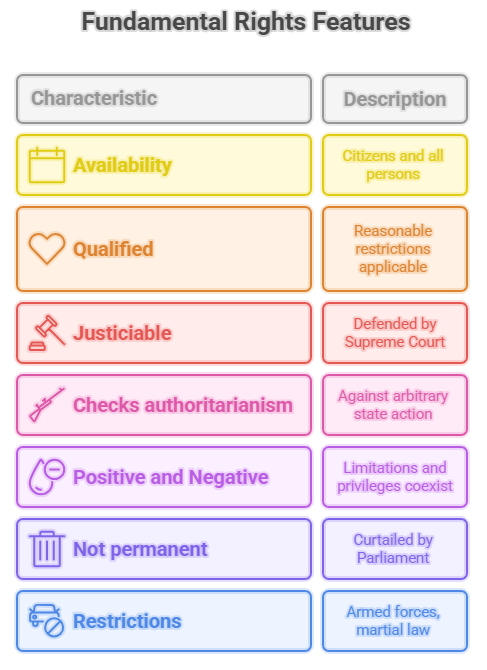 - Positive and Negative in nature: Some of them are negative in character, i.e., place limitations on the authority of the State, while others are positive in nature, conferring certain privileges on the persons.