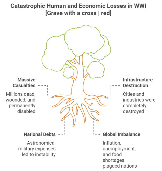 The economic impacts of World War I were catastrophic, especially in Europe. Entire cities, villages, railroads, and industrial zones were destroyed. Nations spent astronomical sums on military expenses, leading to national debts and economic instability.