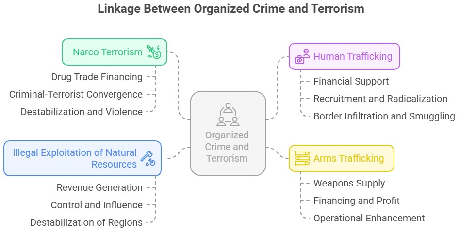 - Cross-Border Movements: Organized crime's smuggling routes are utilized by terrorists for movement.