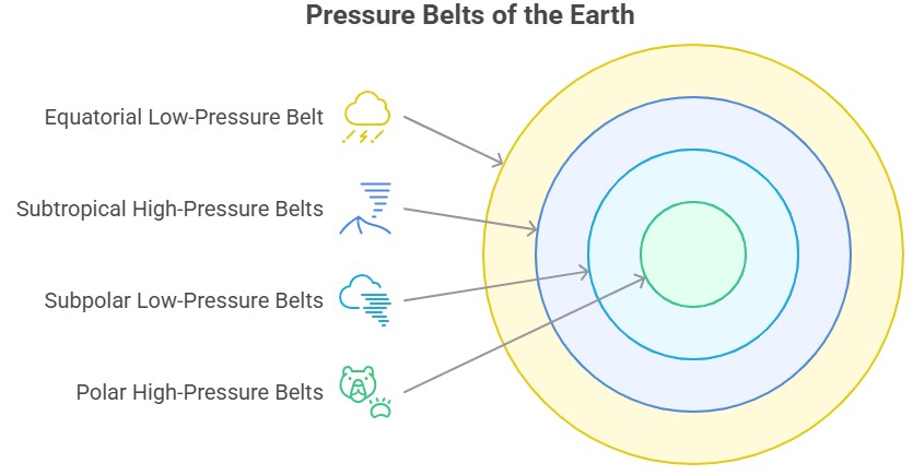 Learn about pressure belts of the Earth – equatorial low, subtropical high, subpolar low, and polar high-pressure zones. Understand their formation, role in global climate, ITCZ, polar front, and impact on weather patterns worldwide.