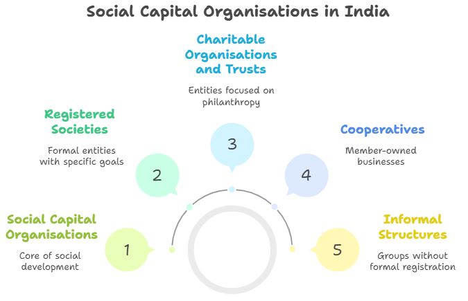 Indian social capital organisations range from huge national NGOs to community-based ones. They greatly advance social development, address social issues, and promote inclusive and sustainable progress.