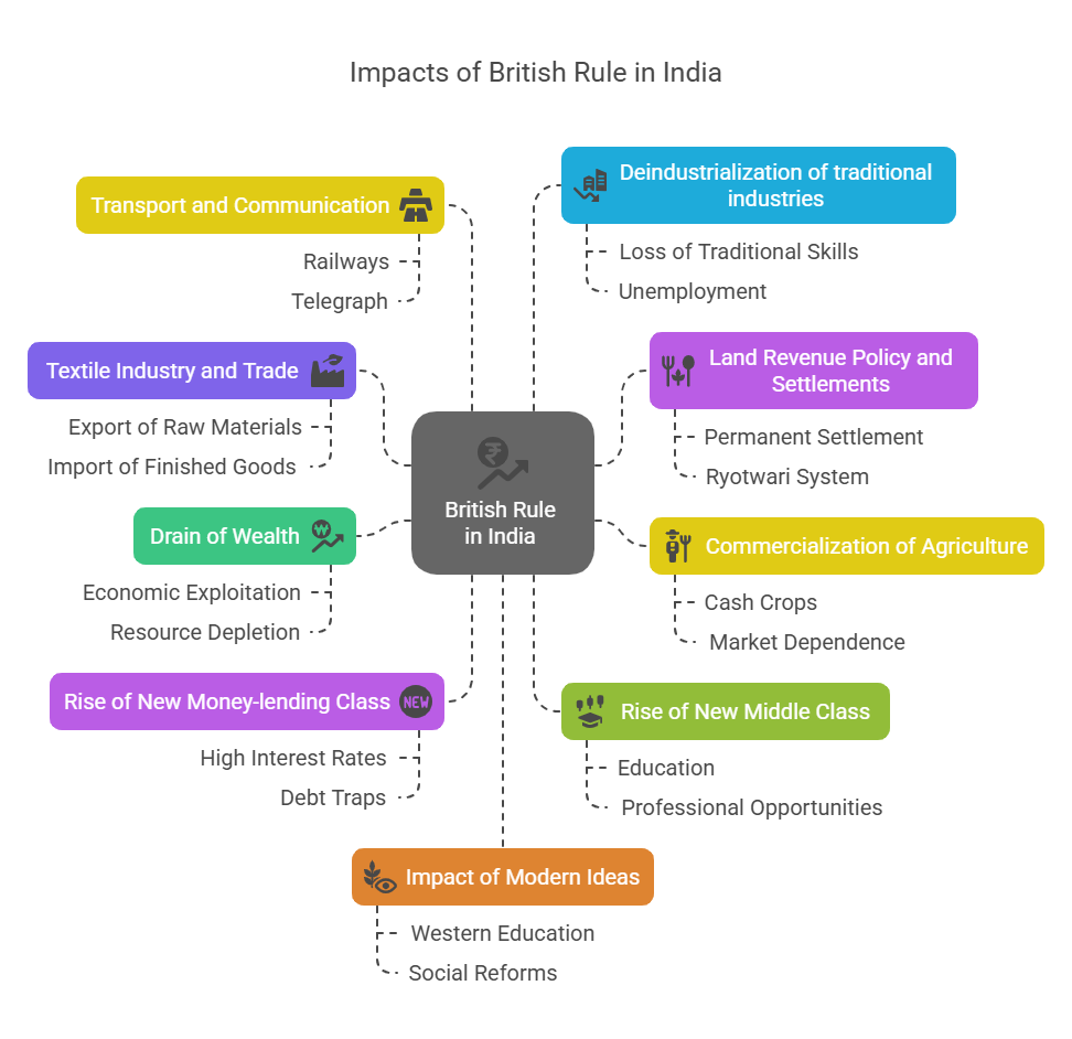Impact of British Rule on India led to economic exploitation, decline of industries, land revenue burdens, and social changes. Learn how colonial policies shaped India.