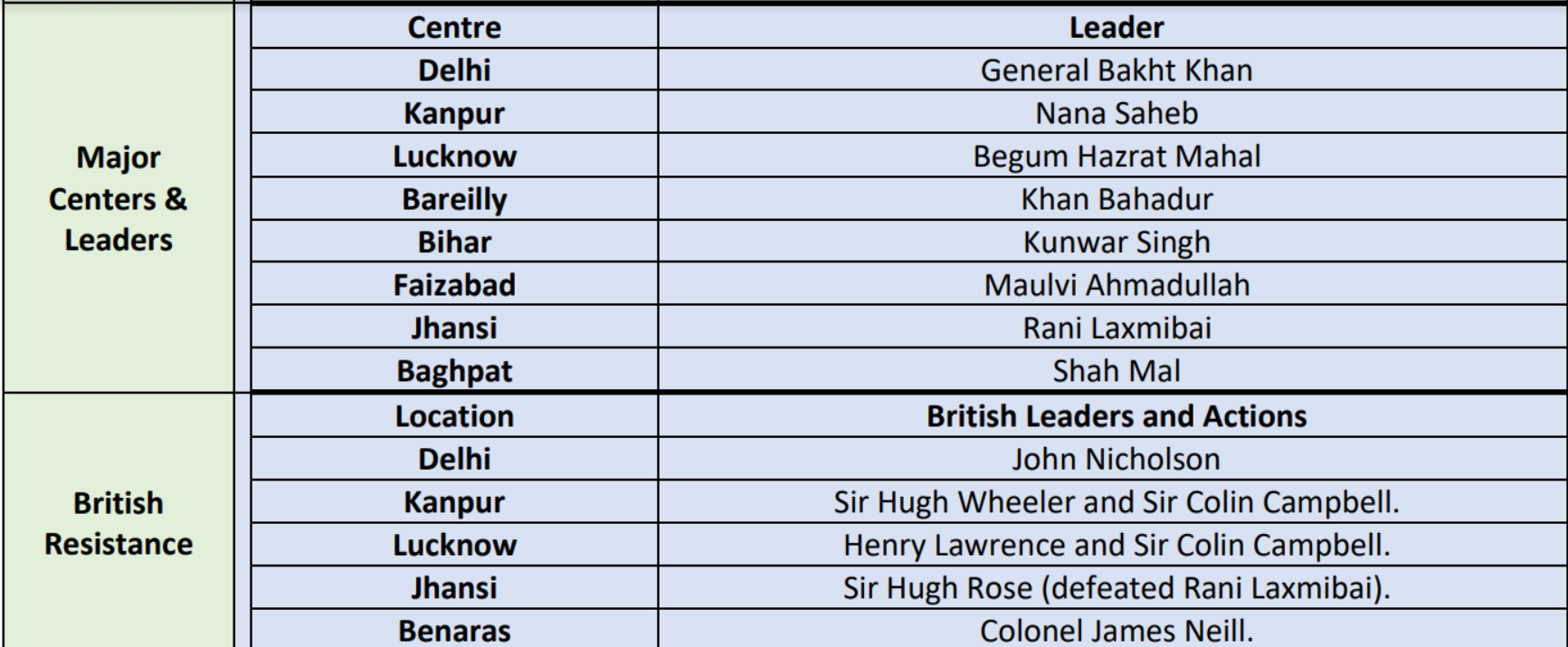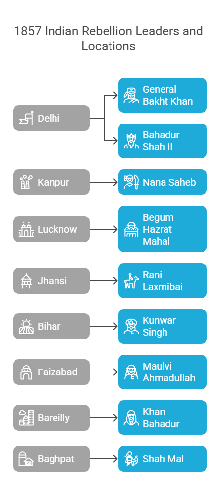 The Revolt of 1857, or India's First War of Independence, saw bitter opposition in most major centers of revolt of 1857 in North India. Indian leaders like General Bakht Khan at Delhi, Nana Saheb at Kanpur, and Rani Laxmibai at Jhansi led the resistance against British domination. But the British, led by officers such as John Nicholson, Sir Colin Campbell, and Sir Hugh Rose, made harsh counterattacks to quell the rebellion. The Delhi, Kanpur, Lucknow, and Jhansi battles are still key milestones in India's fight for independence.