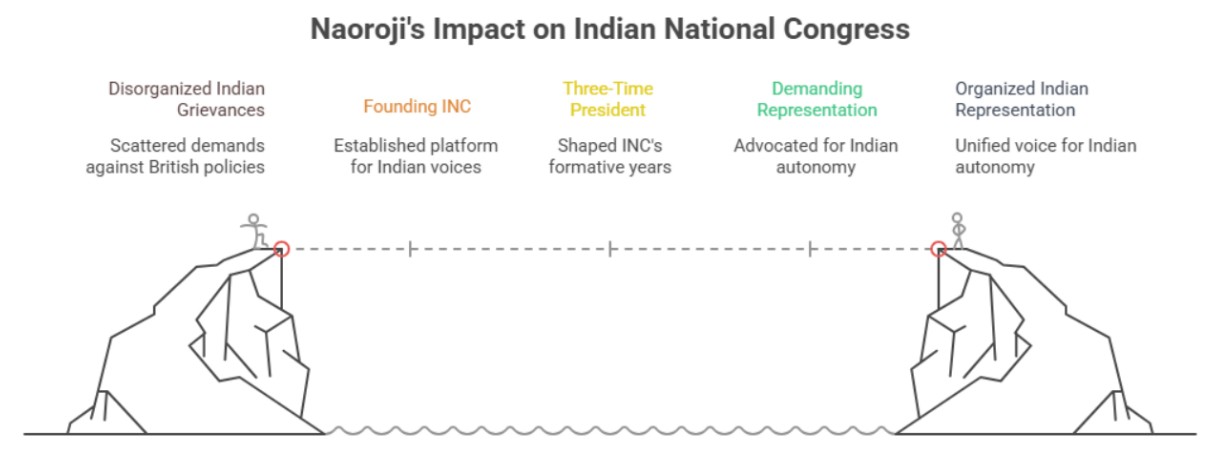 Dadabhai Naoroji played a pivotal role in establishing the Indian National Congress (INC) in 1885. He believed that a platform was necessary for Indians to voice their demands and grievances against British policies.