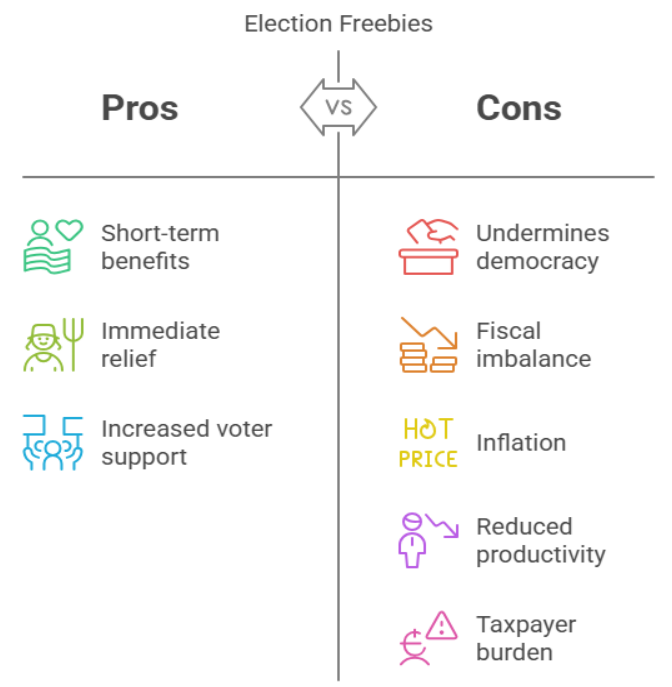 While election freebies can provide short-term relief to vulnerable sections, excessive dependence on them poses serious economic and governance challenges. A balanced approach, where subsidies are given for essential public welfare rather than politically motivated giveaways, is necessary for sustainable development. Empowering regulatory bodies like the ECI, enforcing fiscal discipline, and educating voters will ensure a more responsible approach to election promises.