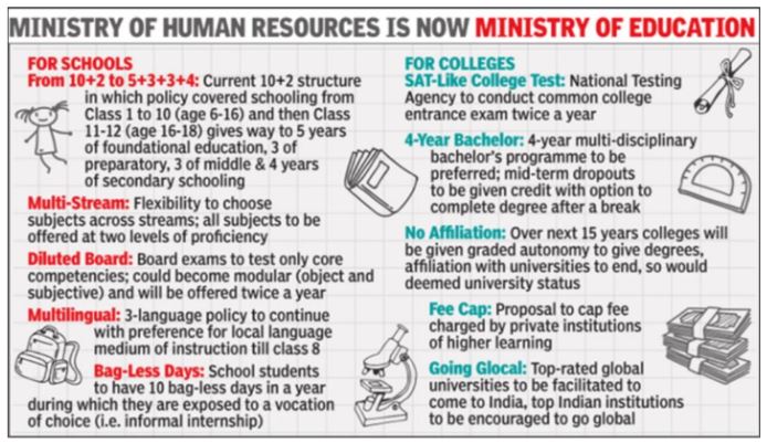 The New Education Policy 2020 moves away from high-stakes board exams and rote memorization. Instead, it promotes:
