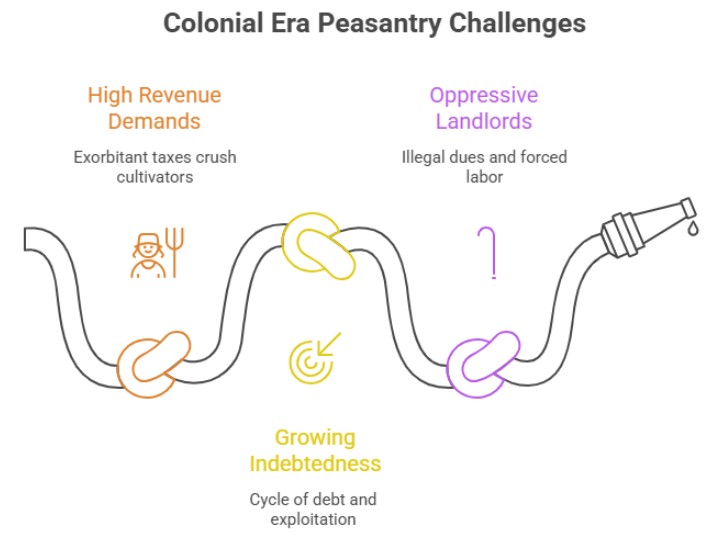 The peasants in colonial India were crushed under the weight of high revenue demands, oppressive zamindari systems, and unfair land tenures. The British introduced systems like the Permanent Settlement, Ryotwari, and Mahalwari, which often favored landlords and revenue collectors instead of the cultivators. As a result, peasants had to pay exorbitant taxes, irrespective of whether crops failed due to famine or natural disasters.