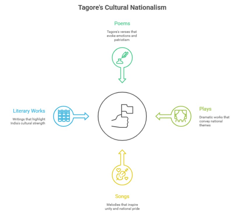 Rabindranath Tagore inspired cultural nationalism through his poems, plays, and songs, which touched the hearts of millions of Indians. His iconic composition “Jana Gana Mana”, which later became India’s national anthem, reflected his deep patriotism and vision of a united India.