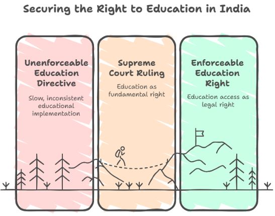 In J.P. Unnikrishnan vs. State of Andhra Pradesh (1993), the Supreme Court ruled that the Right To Education is a fundamental right under Article 21 (Right to Life). This landmark decision gave legal teeth to the notion of education as a right, prompting further action by the legislature.