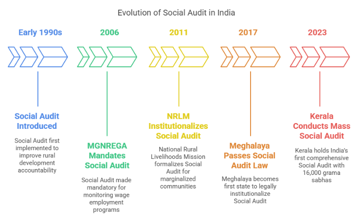 Social Audit was introduced in India in the early 1990s to increase accountability in rural development programs. It gained momentum with the implementation of MGNREGA in 2006, which made Social Audit mandatory for monitoring wage employment programs.