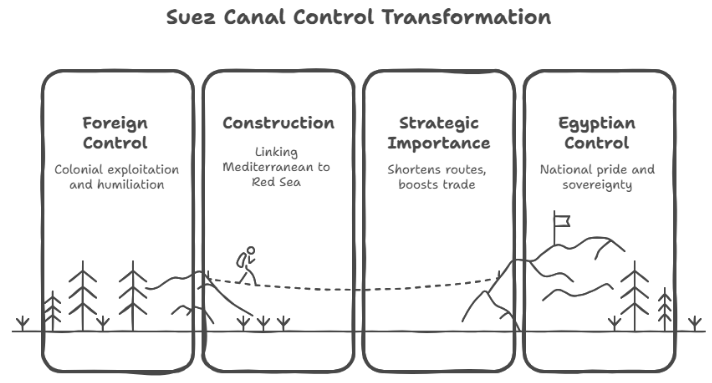 On July 26, 1956, President Gamal Abdel Nasser shocked the world by nationalizing the Suez Canal. He justified his action as a way to fund Egypt's Aswan High Dam project after Western powers withdrew financial support.