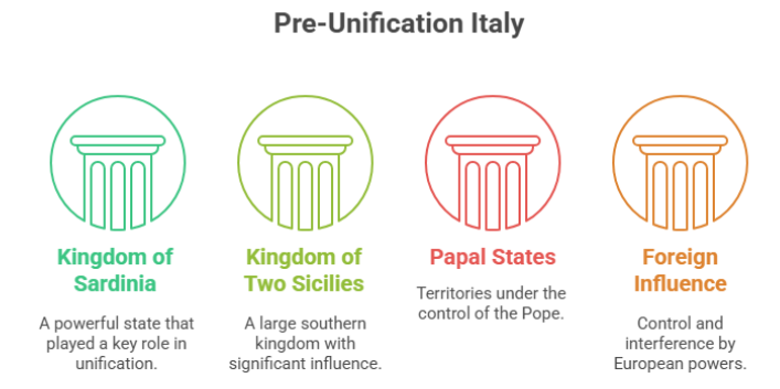 Before the Unification of Italy, the Italian peninsula was divided into multiple independent states and territories. These included the Kingdom of Sardinia, the Kingdom of the Two Sicilies, the Papal States, and various duchies and republics. Many of these regions were under foreign rule or influence from Austria, France, and Spain, which greatly obstructed any collective national movement.