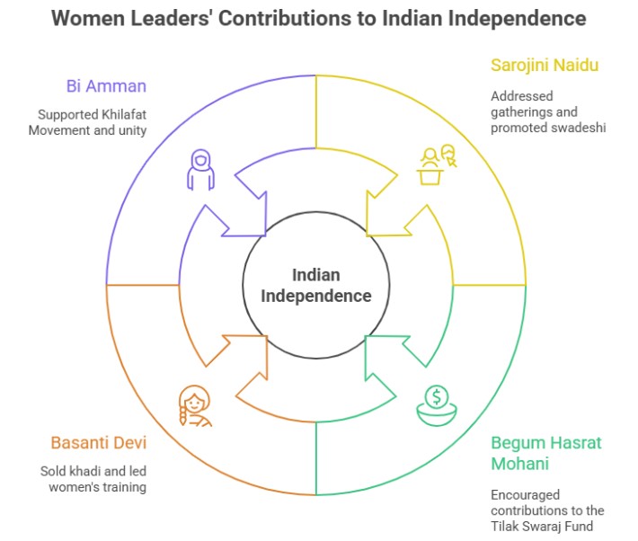 Despite the limited scope, many women emerged as powerful voices. Sarojini Naidu, Begum Hasrat Mohani, Basanti Devi, and Sarala Devi Chaudhurani addressed large gatherings, encouraging women to contribute to the Tilak Swaraj Fund and embrace swadeshi.